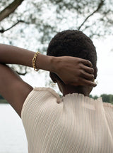 This statement bracelet is made of solid chain and has a T-clasp. It is made of gold plated brass and consists of two types of chains with contrasting design.